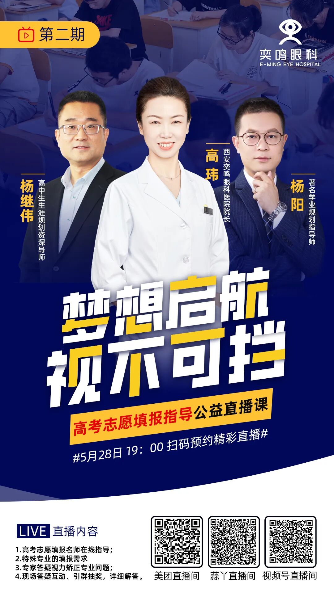 这次【西安奕鸣眼科直播间】请到了西安奕鸣眼科医院院长、第四军医大学眼科学硕士、原武警陕西省总队医院近视激光部主任高玮院长,门道中学生涯规划创始人、著名学业规划指导师杨阳老师,西安启航职业高级中学总督学,高中生生涯规划资深导师杨继伟老师,联手奉上高考志愿填报专业指导以及近视受限专业通关指南,听听他们怎么说!